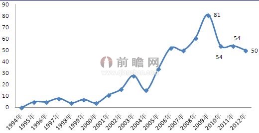 圖表1:1994-2012年我國(guó)外診斷行業(yè)專(zhuān)利申請(qǐng)量(單位:件)