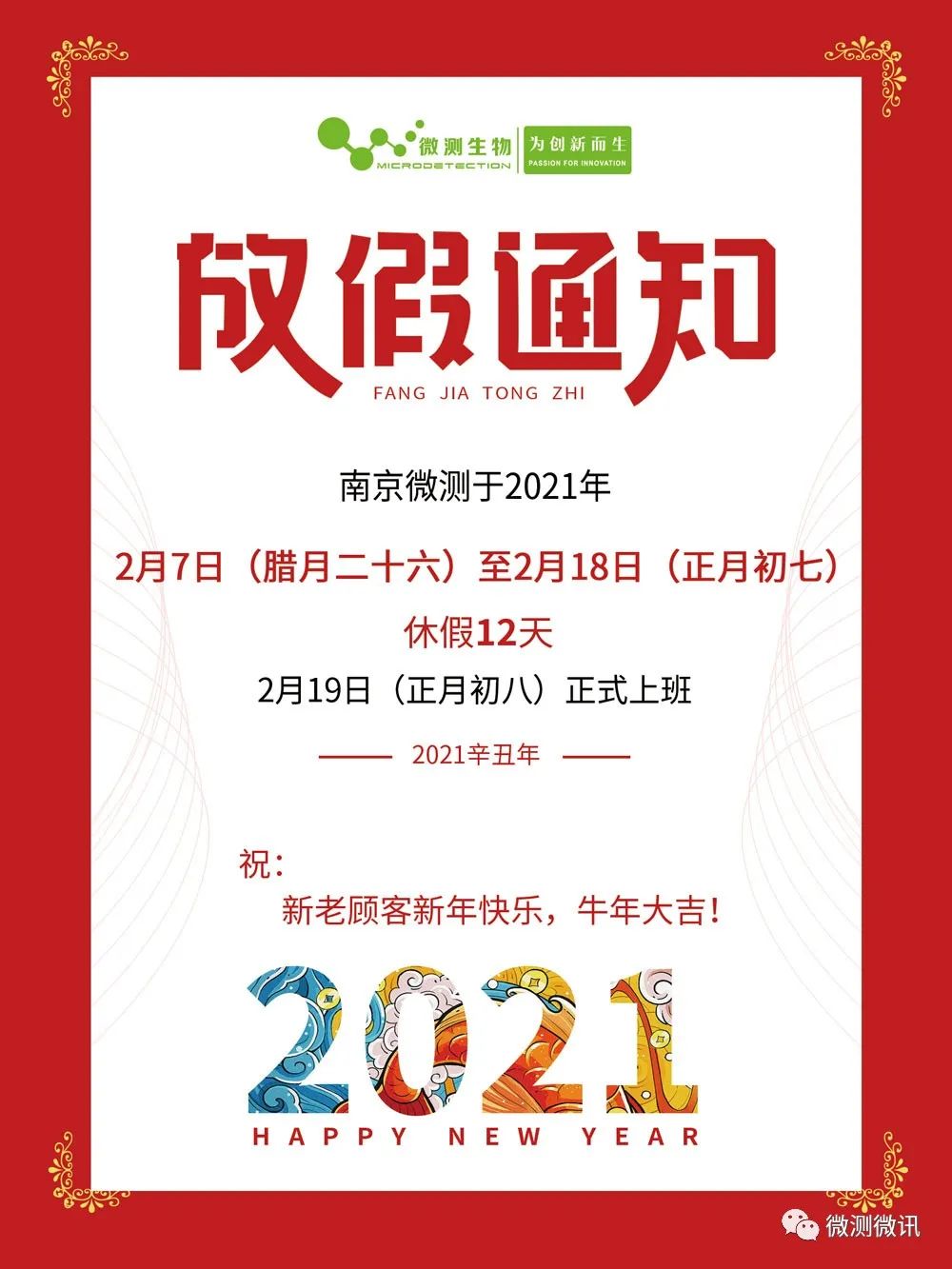 時光荏苒,歲月悠悠,轉(zhuǎn)眼間2020年已經(jīng)過去了,嶄新的2021年正向我們緩緩走來,南京微測根據(jù)國家規(guī)定,對2021年春節(jié)放假的時間安排如下: