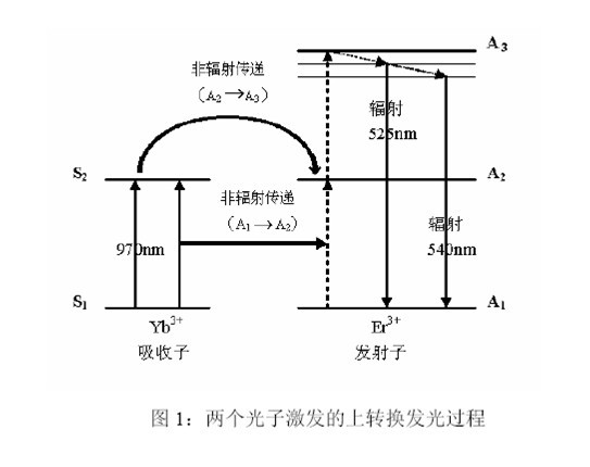自然界中存在很多有機(jī)或無(wú)機(jī)物質(zhì),它們可以在電磁輻射激發(fā)下發(fā)射熒光或磷光,且在發(fā)光過(guò)程中遵守Stokes 規(guī)則,即發(fā)射光的波長(zhǎng)長(zhǎng)于激發(fā)光的波長(zhǎng)。而在20 世紀(jì)70 年代,科學(xué)家們卻合成了一類可以反Stokes 規(guī)則產(chǎn)生磷光的特殊材料,即UCP。UCP 在紅外光區(qū)(波長(zhǎng)>780nm)被激發(fā),卻可以發(fā)射波長(zhǎng)遠(yuǎn)短于激發(fā)光的可見光(波長(zhǎng)475nm-670nm),即能量上轉(zhuǎn)換。物質(zhì)構(gòu)成決定性質(zhì)特點(diǎn)。UCP 是由稀土金屬元素?fù)诫s于晶體的晶格中構(gòu)成的。在這種材料中有三種主要的成分:主基質(zhì)(Host Matrix)、吸收子(Absorber)和發(fā)射子(Emitter)。作為主基質(zhì)的晶體材料有:氧硫化物(如Y2O2S、GdO2S、La2O2S 等)、氟化物(如YF3、GdF3、LaF3 等)、鎵酸鹽(如YGaO3、Y3Ga5O12 等)以及硅酸鹽(如YSi2O5、YSi3O7 等)等;常用作吸收子的稀土金屬離子有:鐿離子(Yb3+)、鉺離子(Er3+)、釤離子(Sm3+)等;常用作發(fā)射子的稀土金屬離子有:鉺離子(Er3+)、鈥離子(Ho3+)、銩離子(Tm3+)、鋱離子(Tb3+)等。吸收子和發(fā)射子這一離子對(duì)在主基質(zhì)晶格內(nèi)適宜的空間取向和距離,是產(chǎn)生上轉(zhuǎn)換發(fā)光的基礎(chǔ)。上轉(zhuǎn)換發(fā)光的產(chǎn)生是一個(gè)涉及多個(gè)(至少兩個(gè))光子的光學(xué)過(guò)程。在這個(gè)過(guò)程中(如圖1),UCP 內(nèi)的吸收子(如Yb3+)至少要吸收兩個(gè)低能量光子(紅外光區(qū),如970nm),而后經(jīng)過(guò)一系列內(nèi)部能量轉(zhuǎn)換,以非輻射的形式(A1→A2,A2→A3)將這兩個(gè)光子的能量連續(xù)傳遞給發(fā)射子(如Er3+),以使其處于激發(fā)態(tài)(A3)。后者接著發(fā)生一個(gè)返回基態(tài)能級(jí)的躍遷,釋放一個(gè)高能光子(可見光區(qū),如525nm 或540nm),完成能量上轉(zhuǎn)換。